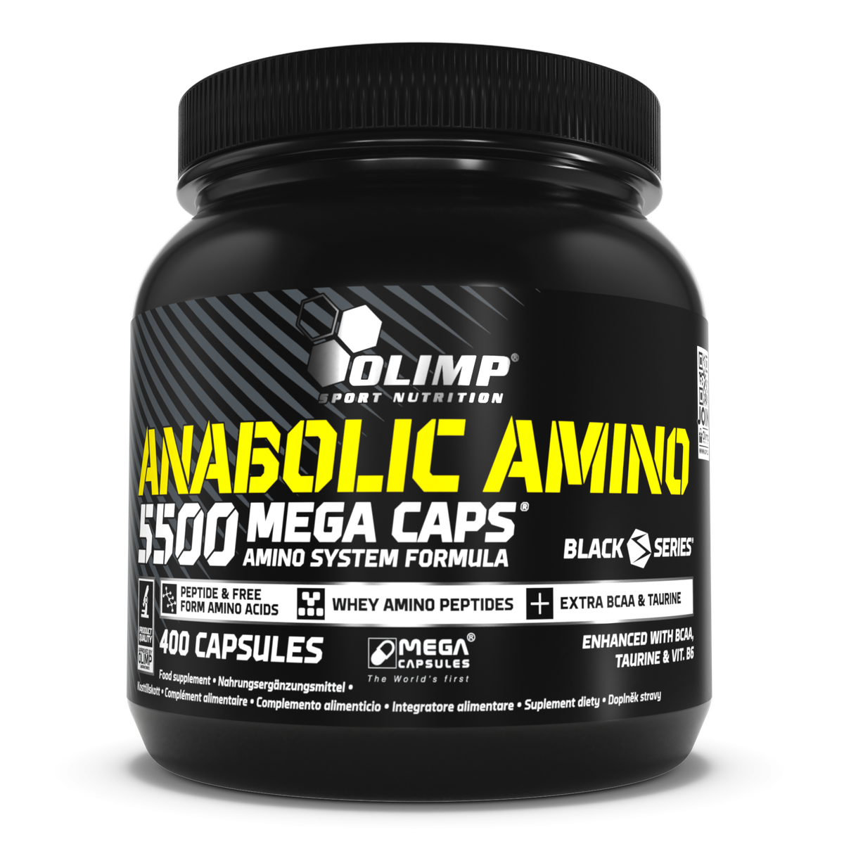 Olimp Anabolic Amino 5500 Mega Caps – Nahrungsergänzungsmittel in Kapselform mit Molkeneiweißpeptiden und freien Aminosäuren. Proteine tragen zu einer Zunahme und zur Erhaltung von Muskelmasse bei.