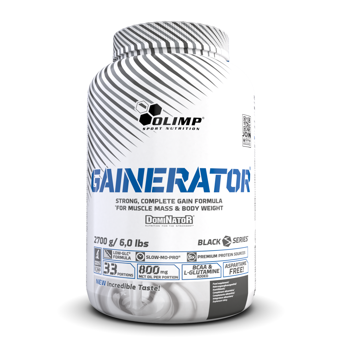 Olimp Gainerator. Nahrungsergänzungsmittel mit Zuckern und Süßungsmitteln. Kohlenhydrat-Protein-Konzentrat in Pulverform. Die Mischung von Kohlenhydraten und Eiweißerzeugnissen, angereichert mit Aminosäuren (verzweigtkettigen Aminosäuren BCAA: L-Leucin, L-Valin, L-Isoleucin; L-Glutamin), MCT-Öl und gepuffertes Kreatinmonohydrat (Kre-Alkalyn). Proteine tragen zu einer Zunahme und zur Erhaltung von Muskelmasse bei. Das Produkt ist vor allem für aktive Personen und Sportler bestimmt.