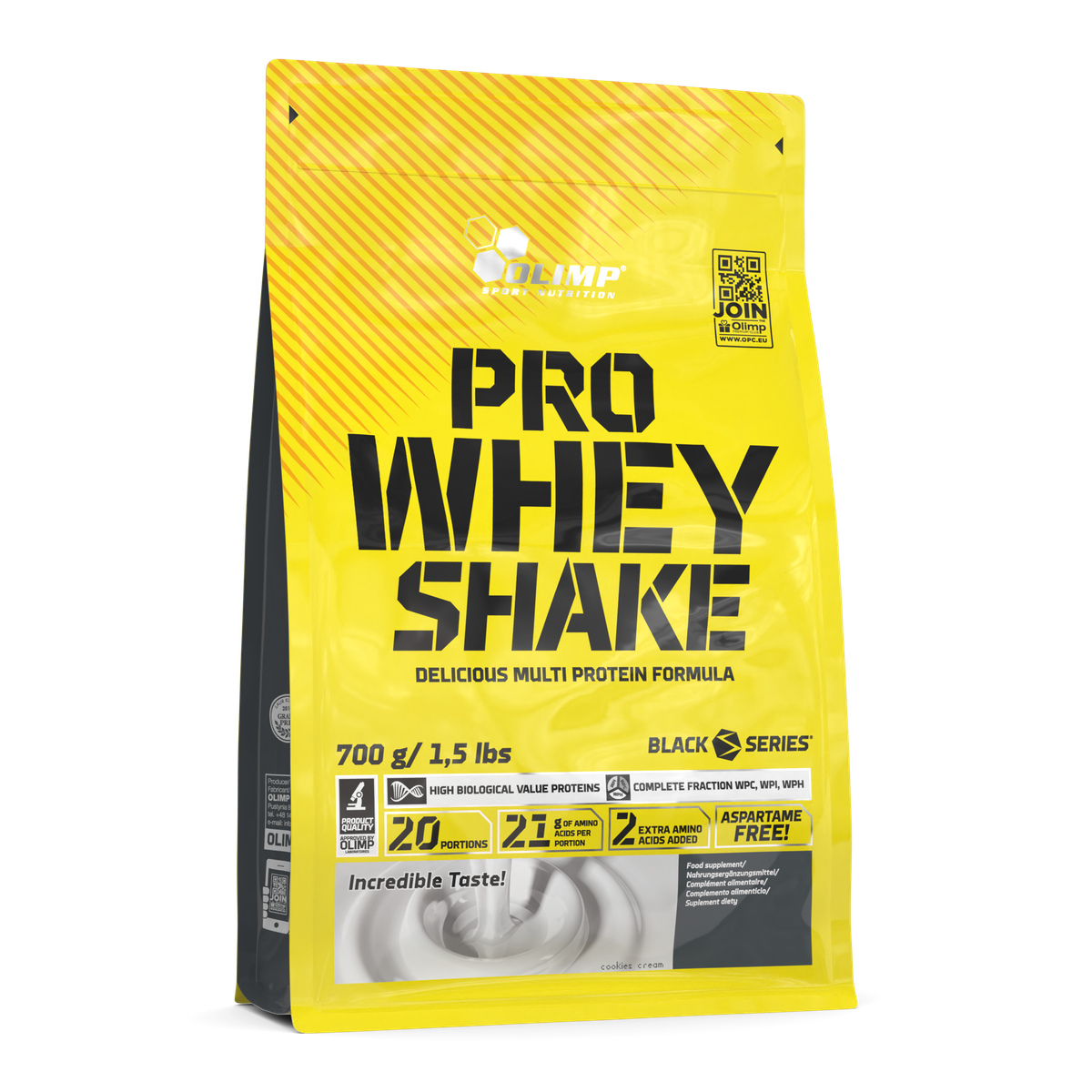 Olimp Pro Whey Shake. Nahrungsergänzungsmittel in Pulverform mit Zuckern und Süßungsmitteln. Eine Komposition von allen Schlüsselpeptidfraktionen von Molkeneiweißen bestehend aus drei Formen: Konzentrat, Isolat und Hydrolysat. Proteine tragen zu einer Zunahme und zur Erhaltung von Muskelmasse bei. Das Produkt ist für Personen mit einem größeren Eiweißbedarf bestimmt, die den Aufbau der Muskelmasse anstreben – vor allem für aktive Personen und Leistungssportler.
